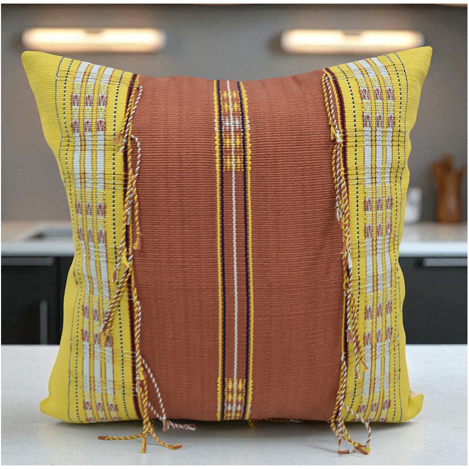 This cushion cover is carefully crafted on the traditional loin loom, showcasing the beauty of handmade textile art.